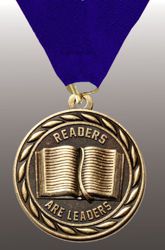 - Detailed medal with raised letters reading 'Readers Are Leaders' and book