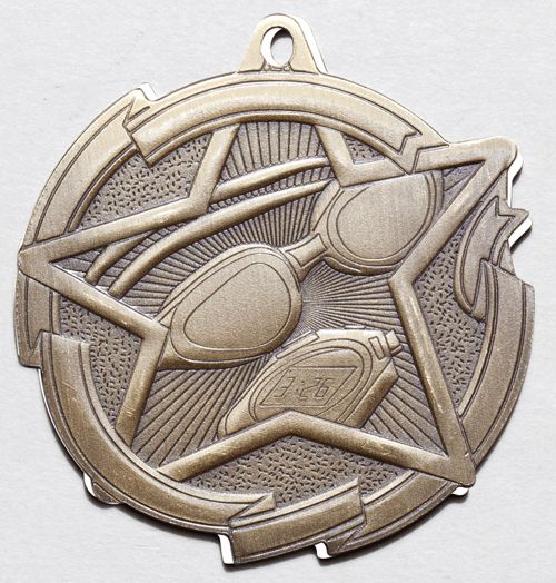 Dimensional detail of swim goggles and stopwatch within raise star outline