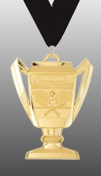Bright gold trophy cup has dimensional crossed racquets, ball, and net