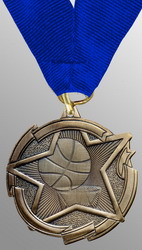 - Dimensional detail of basketball with hoop and net within raise star outline