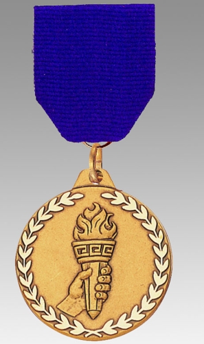 1 ¼” diameter gold medal with color choice of ribbon drape