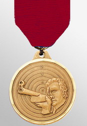 Medallion is gold with raised design of shooter and rifle; target is background