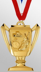 - Bright gold trophy cup has dimensional design of winged foot and timer