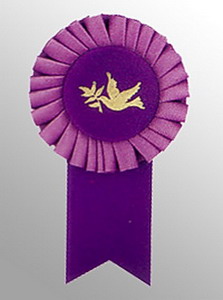 The example shown has a lavender satin rosette, purple satin button and streamer/ The print color is gold, the button uses a stock (no extra cost) image.