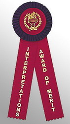 The example shown is a navy blue satin rosette with a red button and streamers. The print color is gold. The button uses a "no extra cost" stock print. The streamer has a custom text at no additional cost.