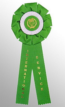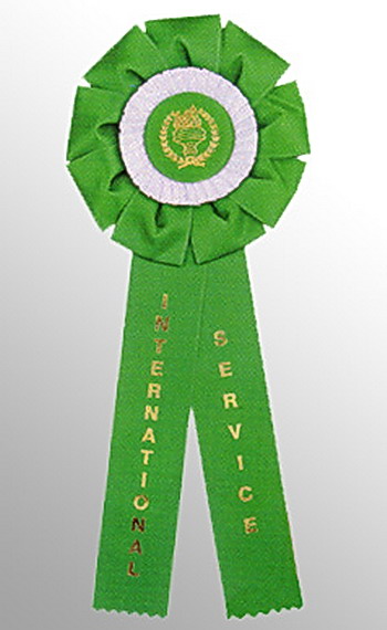 The example shown is a white inner and green outer satin rosette with a green button and streamers. The print color is gold. The button uses a "no extra cost" stock print. The streamer has a custom, no extra cost, text.