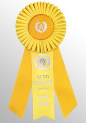 The example shown is a yellow satin rosette with old gold satin button and side streamers. The foil print color is silver. The button uses a "no extra cost" stock print. The streamer has a custom, yet no extra cost, text; but a custom extra cost logo print.