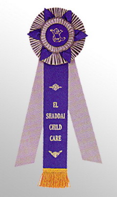 The example shown is a grey and blue satin rosette with a blue satin button. The foil print is gold. The button uses a no extra cost stock print. The text on the streamer is no extra cost. The gold fringe on the streamer is $1 extra.