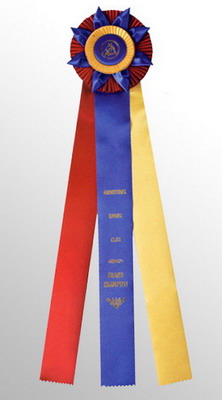 The example shown is an old gold, blue and red satin rosette with a blue satin button. The foil print color is gold. The button uses a no extra cost stock print. The text on the streamer is no extra cost.