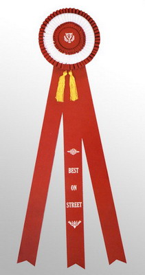 The example shown is a white and red satin rosette with a red satin button. The foil print color is silver. The button uses a no extra cost stock print. The text on the streamer is no extra cost. The tassels are extra cost; $1.60.