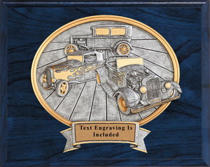 Ribbon banner in silver with gold edges holds oval award and engraving plate