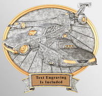 Ribbon banner in silver with gold edges holds oval award and engraving plate