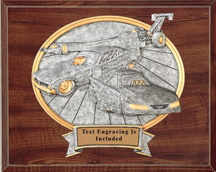 Ribbon banner in silver with gold edges holds oval award and engraving plate