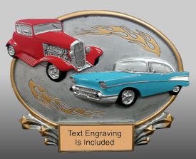 Ribbon banner in silver with gold edges holds oval award and engraving plate