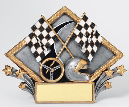 - Race helmet, steering wheel, and flags are 2-dimensional realistic sculpt