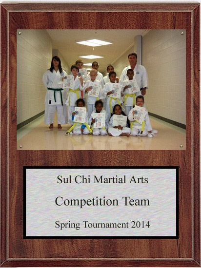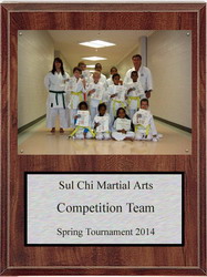 Commemorate martial arts team with a 15" tall x 12" wide cherry wrapped plaque