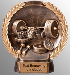 - Deep Spanish gold oval with detailed dimensional weightlifter