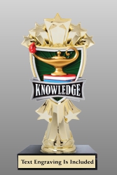 - Hand painted golden lamp sits upon a stack of multi-colored books