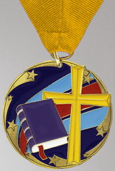 Vivid color display with gold cross, and scripture