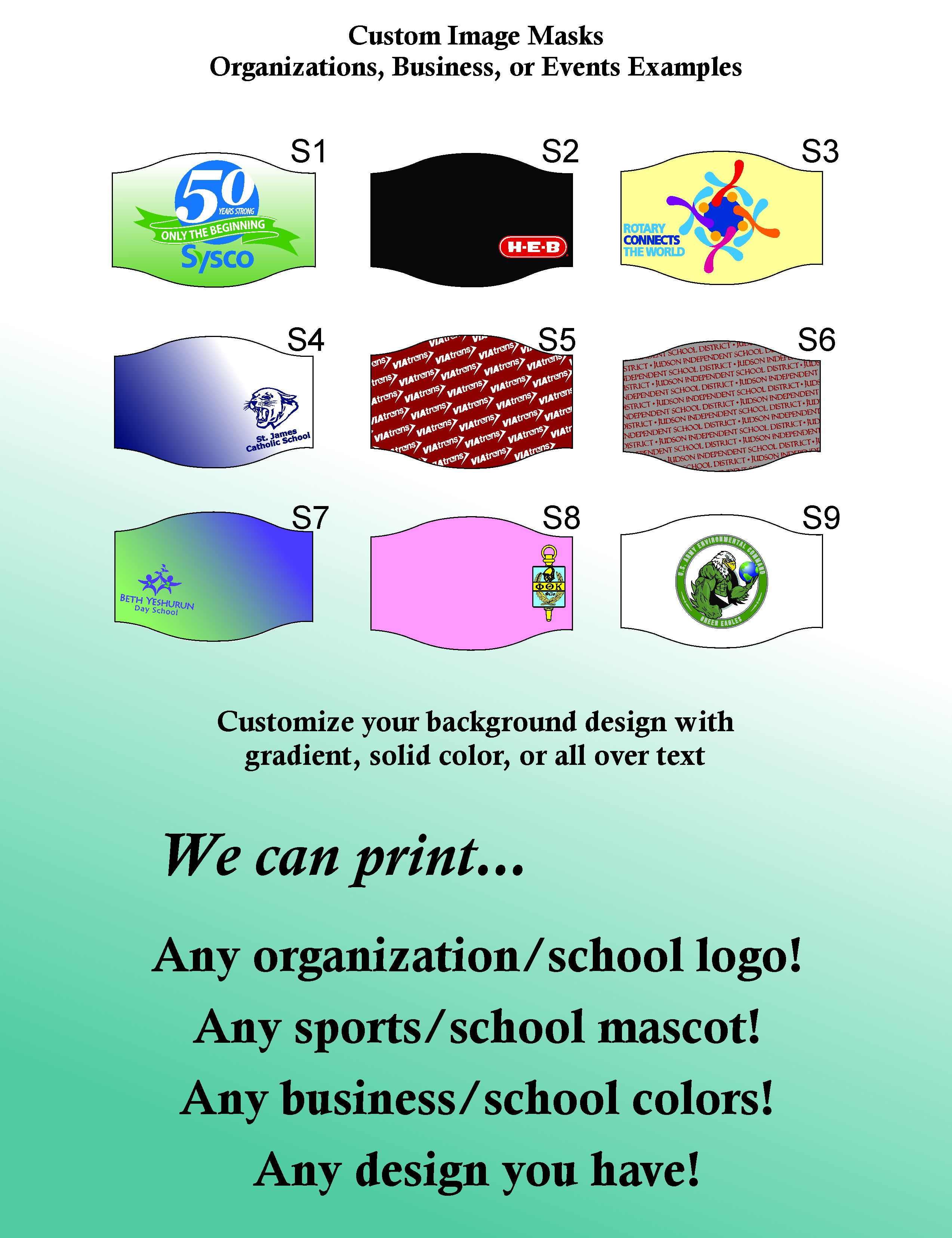 Can be personalized with your logo, mascot, and colors. (Samples in zoom)
