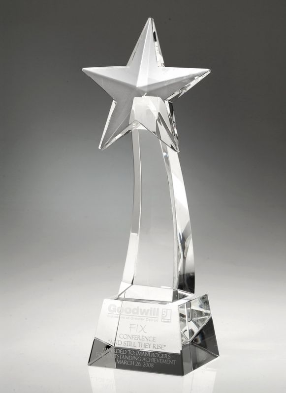 Optical crystal dimensional star is on an arched arm attached to a crystal base